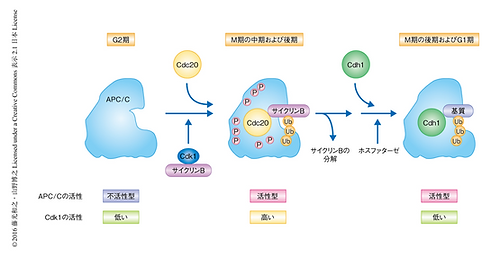 タンパク質を分解するシステムの一つとしてユビキチンープロテアソーム系が挙げられる。その中でユビキチン結合酵素(E2)に結合したユビキチンを標的タンパク質に転移させるユビキチンリガーゼ(E3)として、有糸分裂のM期に関係するタンパク質の分解を行う後期促進複合体(APC)が存在する。サイクリン依存性キナーゼ(Cdk1)とサイクリンBが結合することでM期の開始を指示し、APC活性化タンパク質であるCdc20とCdh1がそれぞれ有糸分裂中期と後期にAPCを活性化させる。活性化されたAPCがサイクリンBを分解することでM期の終了の合図となる。また、セパレースのコヒーシンを切断する働きを阻害するセキュリンの分解をAPCが誘導することによって、分裂後期へと移行する。今回の研究では、E2の中でUbc1とUbc4がAPC依存的にユビキチン化を行うことを示した。精製したこれら2つのE2と未修飾または既にユビキチン化されたセキュリンやサイクリンを用いた解析から、Ubc4はセキュリン・サイクリンの最初のモノユビキチン化を引き起こし、Ubc1はその後に続くポリユビキチン化を促進させることが示唆された。また、高等真核生物では、Ubc1のホモログであるE2-25KがUbc1と同様の働きをすることが示唆された。加えて、Ubc4の役割は、UbcH5とUbcH10が代替する可能性を提言している。本論文は、2つのE2(Ubc1とUbc4)がそれぞれの役割分担をしながら連携して機能することを初めて明らかにした報告である。(紹介者 今井)
